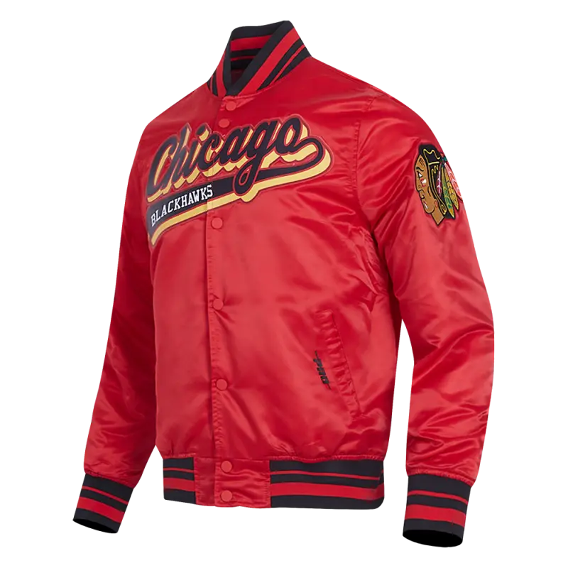 NHL CHICAGO BLACKHAWKS SCRIPT TAIL MEN’S RIB SATIN JACKET (RED\/BLACK)