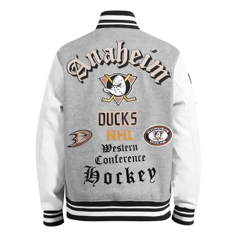 The Pro Standard Premium NHL Anaheim Ducks Old English Men’s Rib Wool Varsity Jacket (Black/Orange)