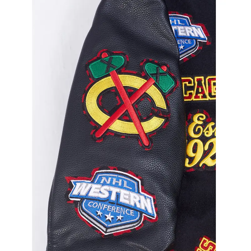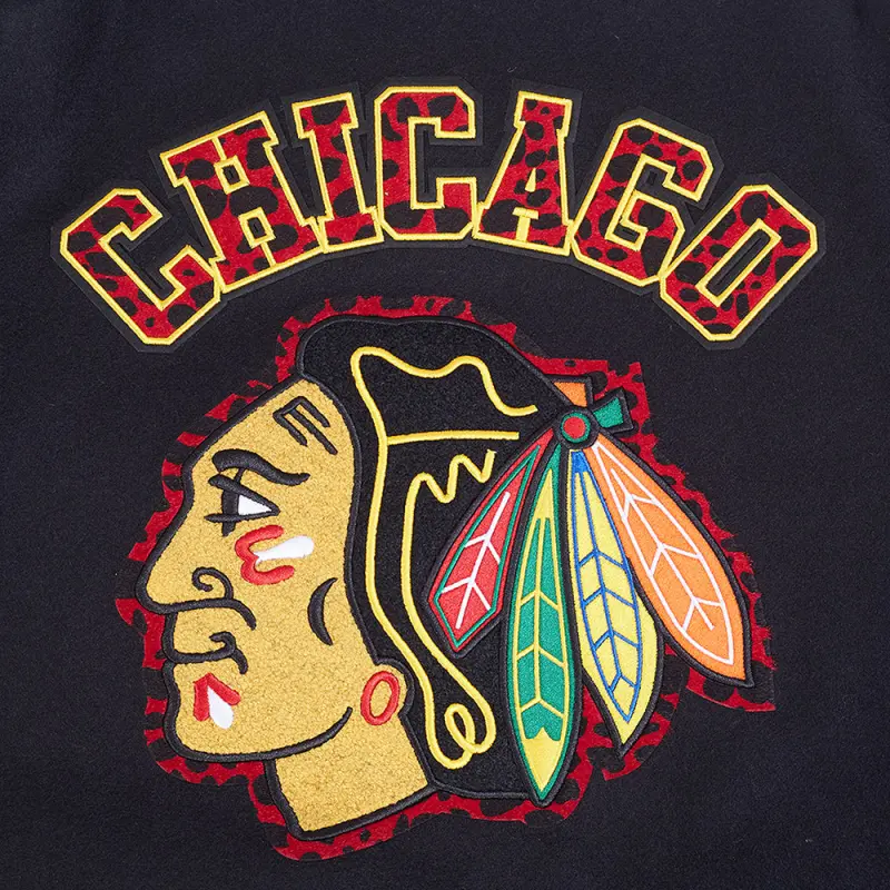 NHL CHICAGO BLACKHAWKS ANIMAL PRINT MEN’S WOOL VARSITY JACKET (JET BLACK)