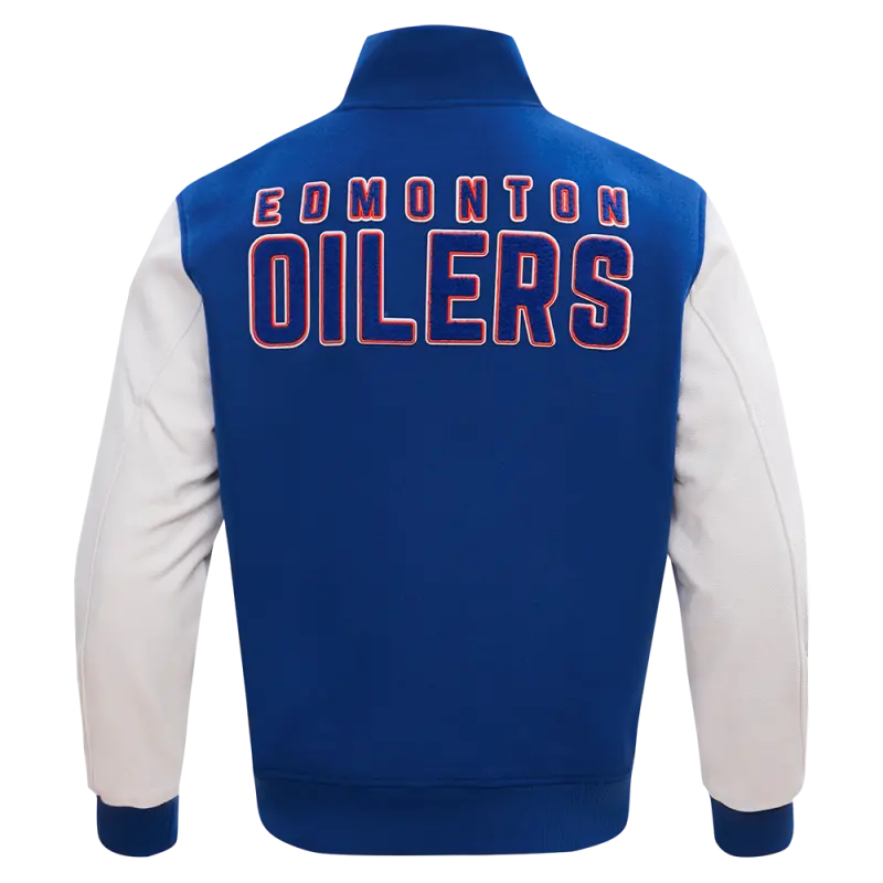 The Pro Standard Premium NHL Edmonton Oilers Classic Wool Men’s Varsity Jacket (Dodger Blue/White)